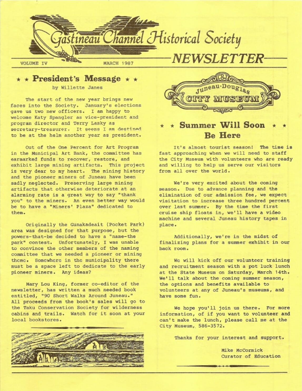 - Juneau-Douglas City Museum: Summer will soon be here by Mike McCormick 1987 4(March): [1]