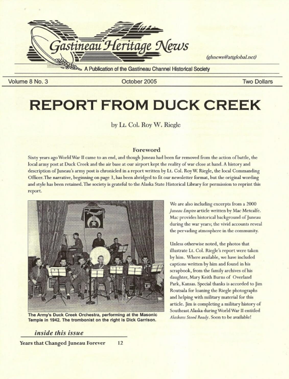 - Report from Duck Creek by Lt. Col. Roy W. Riegle 2005 8(3): 1, 3-12