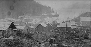 U.S. Navy Commander Rockwell arrived from Sitka to establish a military post to “preserve order” amongst the miners and Indians, but with little action, the post was closed in November. Gold mining in Silver Bow Basin and on Douglas Island, across the channel, proved very productive and the camp flourished with mercantile stores, service establishments, saloons, etc. springing up to provide all the necessary needs. On September 13, John Treadwell bought the “Parris” mining lode claim on Douglas Island from Pierre “French Pete” Erussard for a quit-claim deed of $5, plus up to $400 (estimates vary) to pay a pending freight bill Erussard needed for the next shipment of goods for his store. This claim Treadwell was soon able to develop into the eventual world class Treadwell mine. The first house in Douglas was log cabin reportedly built by William Newcomber, located west of the Treadwell claims although the area was not called Douglas until the mid-1880s..