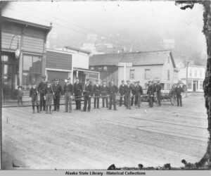 Juneau Fire Department on Front Street with hose cart, ca. 1890. Alaska State Library, Winter & Pond Photo Collection, P87-1186.