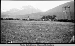 Baseball game on 1st Juneau field by lower Gold Creek. Alaska State Library, J. Simpson MacKinnon Photo Collection, ca. 1880-1945. P14-II-208.
