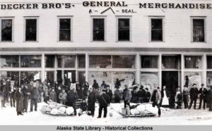 Juneau merchants competed to attract business to outfit stampeders rushing to the Klondike gold fields. Local mines and businesses lose personnel who are also joining the gold rush.