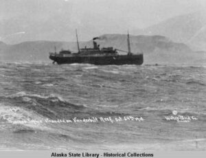 The Princess Sophia ran aground on Vanderbilt Reef north of Juneau in Lynn Canal October 24 during its final seasonal run south from Skagway. Stormy weather prevented transfer of passengers to waiting rescue vessels and all aboard were lost when the ship sank the next night. It was the greatest maritime disaster on the Pacific coast, with loss of at least 353 souls (estimates vary).