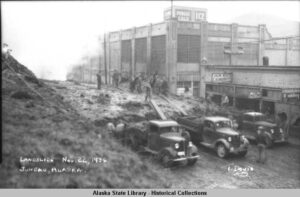 The worst landslide in Juneau’s history roared down the side of Mount Roberts November 22 and killed at least 12 persons, injured at least nine, destroyed four buildings and damaged several others. The slide, triggered by heavy rains, which also caused slides on the Glacier Highway, piled dirt 20 feet deep against the Juneau Cold Storage Company Building on South Franklin Street.