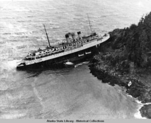 The Canadian Pacific Railroad cruise ship Princess Kathleen ran aground September 7 and sunk on Lena Point. All aboard made it to shore safely and were transported to Juneau for further care. Failure of the officer in command to issue a timely course correction to the helmsman resulted in the vessel ramming up onto the rocks at 9 knots. The vessel sank about ten hours after its collision.